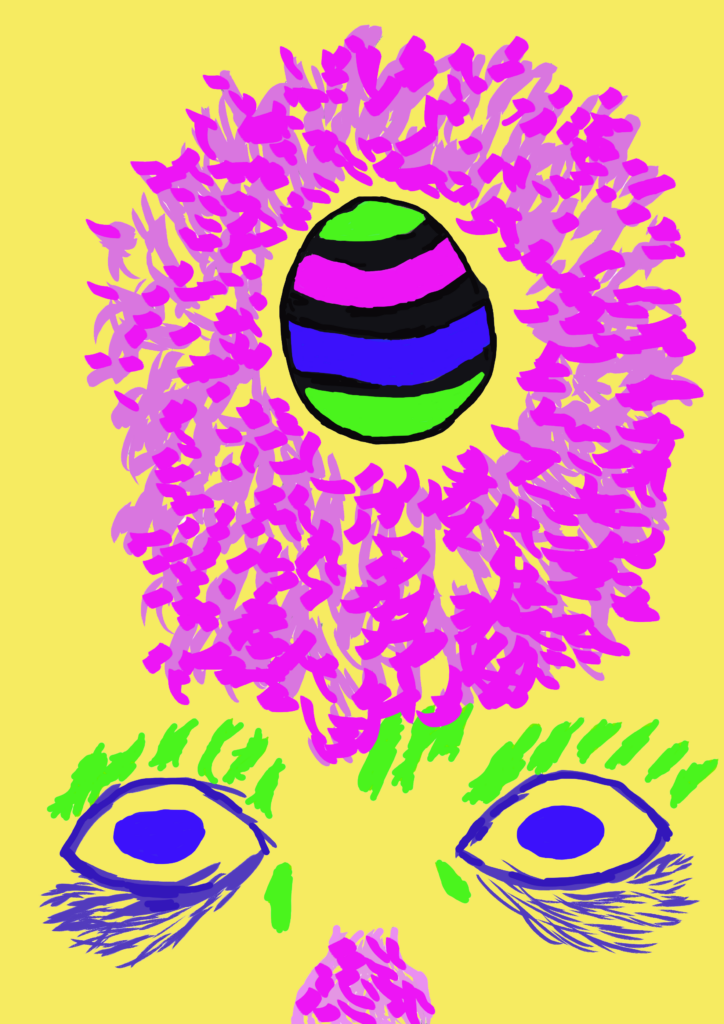 La palette très franche, dominée par le jaune lumineux, le rose intense, le vert acide et le bleu profond, donne à l’ensemble une énergie brute, presque primitive, proche d’un langage intérieur libéré de toute contrainte académique. Le dessin semble osciller entre figuration et écriture automatique, entre masque, fleur et cartographie mentale. Il en ressort une œuvre vibrante, spontanée et énigmatique, qui évoque la naissance de la pensée, l’agitation du rêve ou le tumulte silencieux de la cogitation.